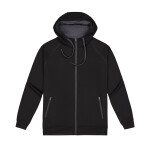 Grid mesh underarm panels for breathability Stow-away hood with print feature Unique sleeve print feature with adjustable cuff Two side zippered pockets Contrast panels, piping and inside placket |